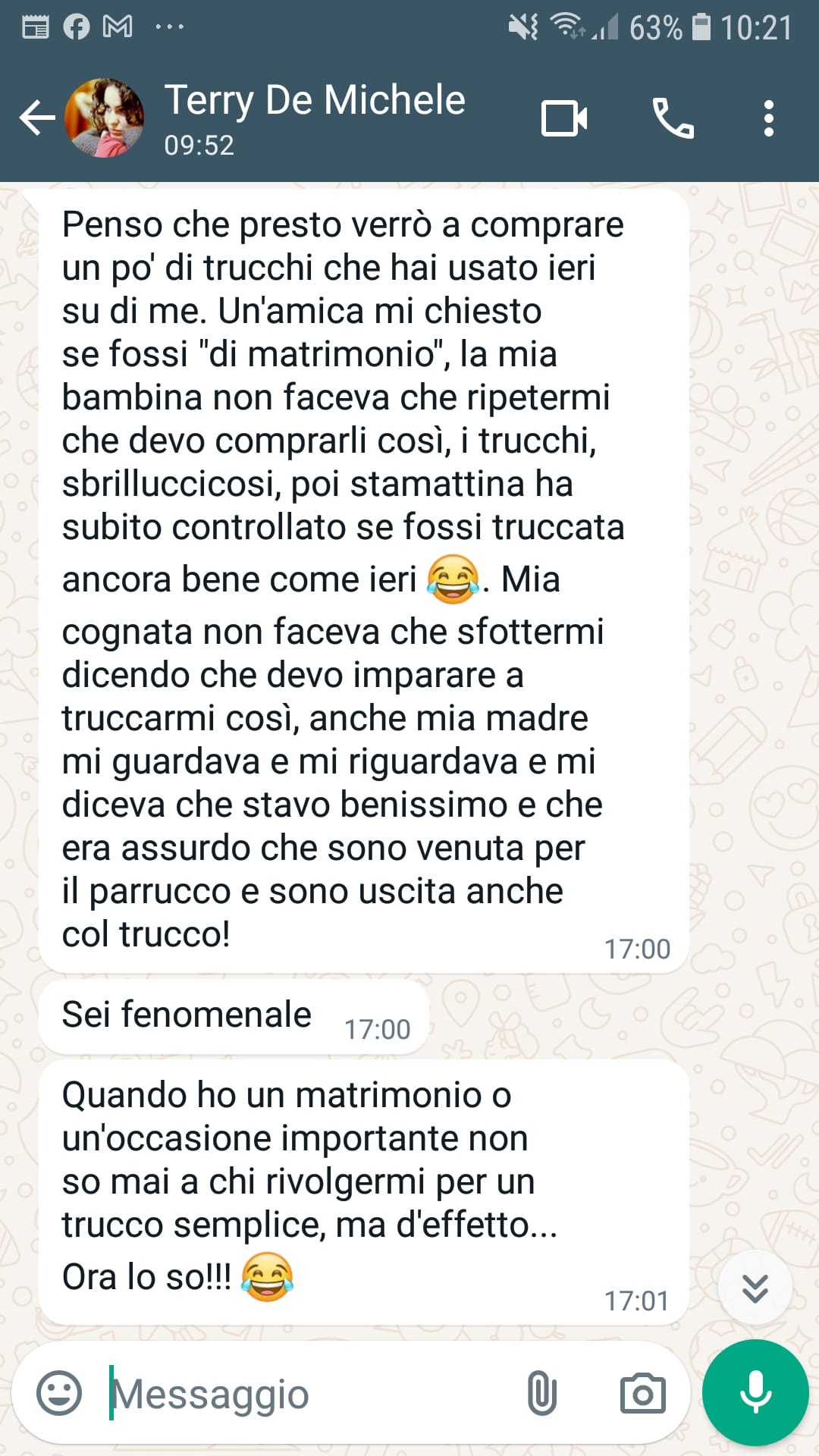 Le ho asciugato i capelli di spalle allo specchio, l’ho truccata rispettando quello che è il trucco leggero che abitualmente usa, ma cercando attraverso le mie conoscenze di armocromia, di valorizzarla con colori perfettamente in armonia con i suoi colori naturali e dopo tutto questo ha potuto guardarsi allo specchio….e stupirsi del risultato…e tutto questo lo vedete nel video e lo leggete nel messaggio del giorno dopo.