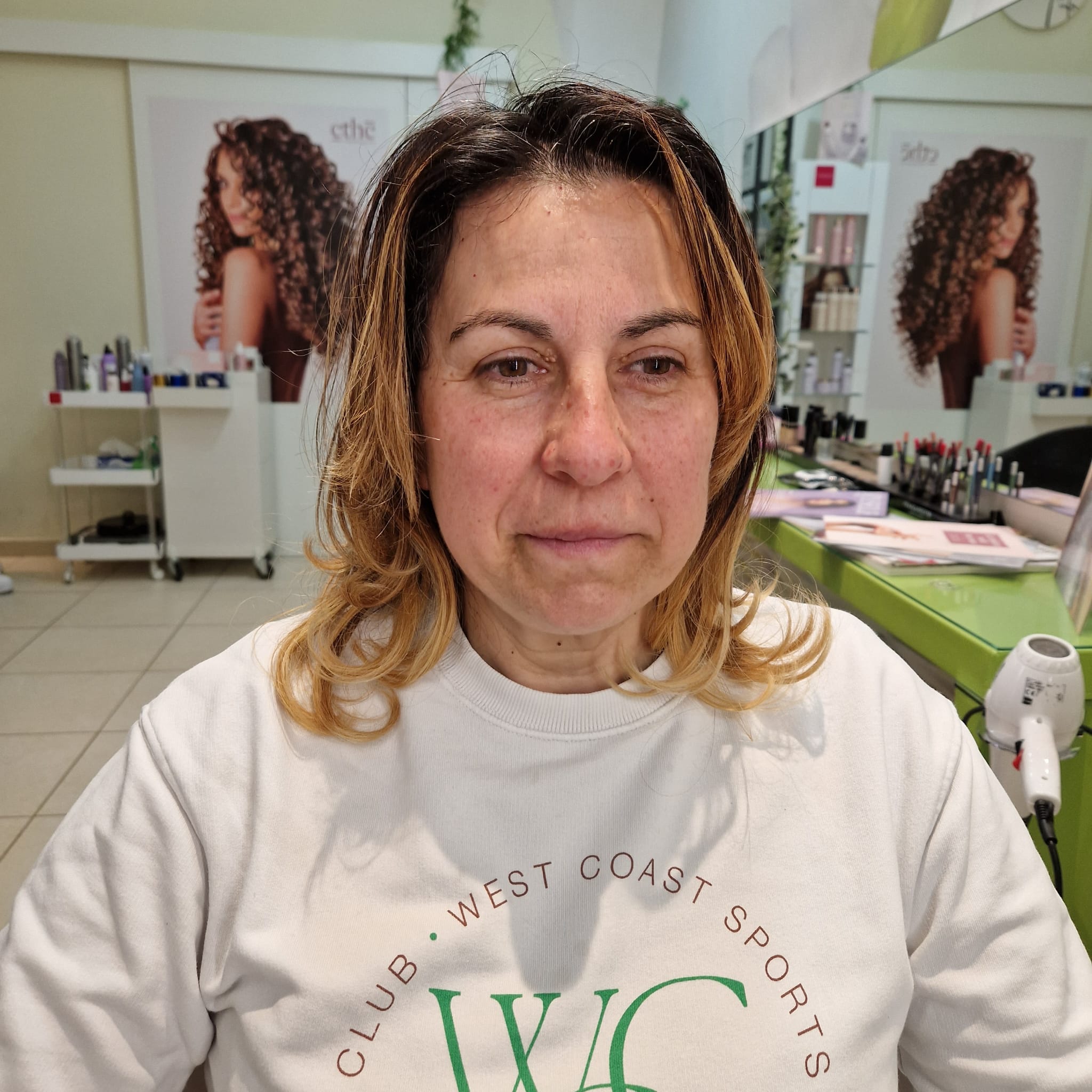Le ho proposto un taglio nuovo che le permettesse di vedersi diversa, e in base ai suoi colori naturali ho pensato anche a schiarire il colore dei suoi capelli per illuminare il suo viso molto stanco!