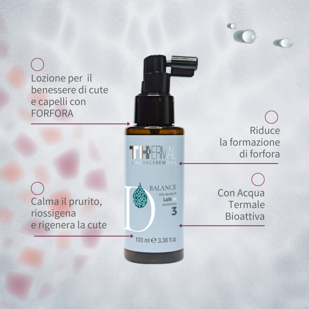 Terminato lo shampoo, lo step successivo sarà l’utilizzo dell’acqua termale per ripristinare il ph cutaneo, associata alla lozione antiforfora che grazie al piroctone olamina e all’olio di pino silvestre normalizza l’eccesso di sebo e con il sodio ialuronato e l’alga marina garantisce la perfetta idratazione nel tempo, della cute.